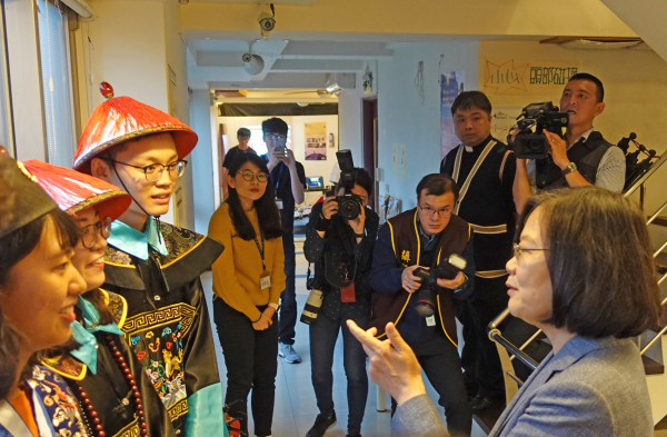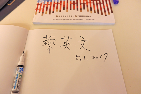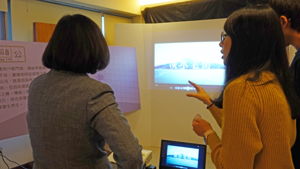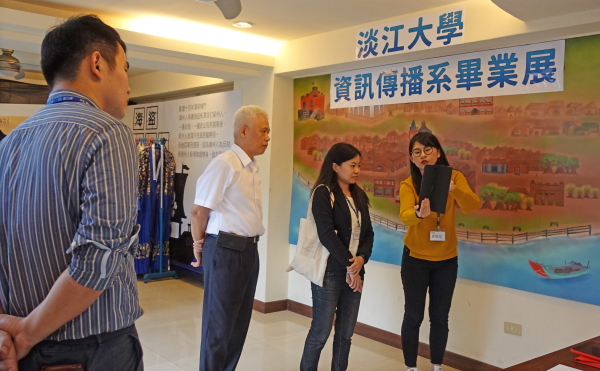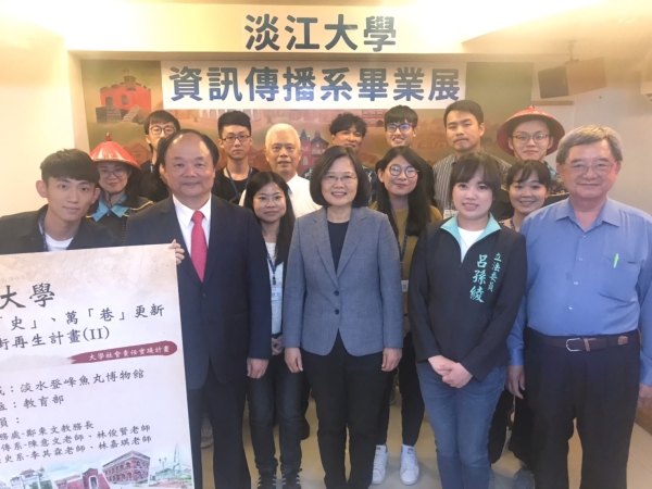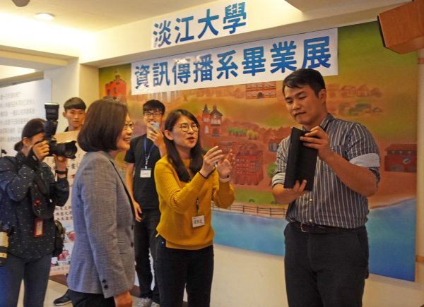 蔡總統於5月1日親臨會場觀展,聽取學生創作歷程與創意成果,不僅高度肯定同學們的實作能力,更認同淡江大學深耕淡水的在地思維;導覽過程中,同學們換上古裝粉墨登場,蔡總統親切詢問關於老街的辦展心得、舊服飾的考證年代與官階背景,並透過平板電腦與馬偕海報互動,理解「馬偕AR」的海報顏色變化與其象徵意義,總統連聲讚嘆新科技與新媒體的應用的確有其效益。最後,則欣賞空拍淡水的形象影片,對於淡水的壯麗山海與秀麗古蹟留下深刻印象,並由衷祝福後續計畫發展順利、資傳系畢業展圓滿成功!