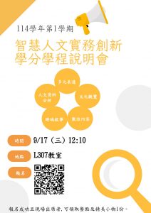 本學期舉辦智慧人文實務創新學分學程說明會,邀請對本學程有興趣之同學參加。